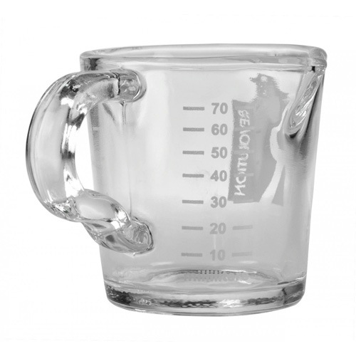 Revolution(レボリューション)のショットグラス、 取っ手は熱さから手を守り、注ぎやすい形状となっております。 【オンス】と【ミリリットル】表示 0.5oz.刻み//10ml刻み。 通常、ダブルスパウトから抽出されるエスプレッソは2ozのショットグラスだと2つ必要だが、こちらの商品は1つで受けられ、ます。