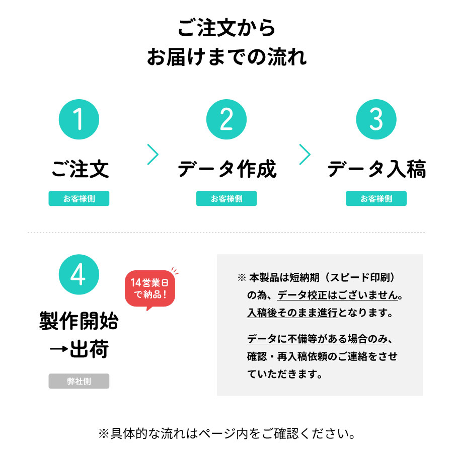 ※本製品は短納期(スピード印刷)の為、データ校正はございません。入稿後そのまま進行となります。